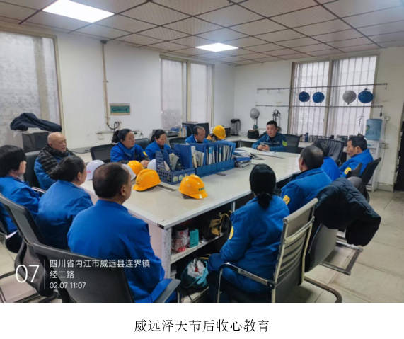 為進一步壓實企業(yè)主體責任,加強安全生產(chǎn)宣傳教育,提高生產(chǎn)部門的安全意識,共同營造安全和諧的生產(chǎn)氛圍,度過一個平安、祥和的春節(jié)假期。1月22日,威遠澤天公司采取“線下+線上”相結(jié)合的方式,開展2025年春節(jié)期間節(jié)前安全生產(chǎn)教育培訓,公司各部門和凈循環(huán)銘洋勞務全體員工等84人參加了本次培訓。 本次培訓圍繞四個方面開展:第一方面講解安全生產(chǎn)常識;第二方面講解從業(yè)人員心態(tài);第三方面講解安全生產(chǎn)行為規(guī)范;第四方面……